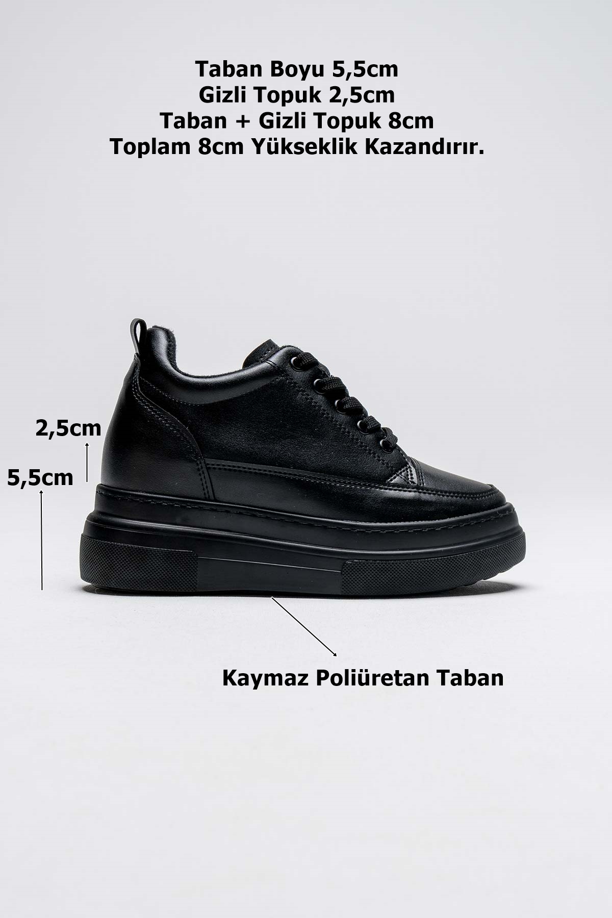 <h2 data-start="371" data-end="424"><strong data-start="374" data-end="424">Gizli Topuk Sneaker (8 cm)</strong></h2><p data-start="426" data-end="665"><strong data-start="426" data-end="459">Her adımda 8 cm farkı hisset!</strong><br data-start="459" data-end="462">Gizli topuk teknolojisi sayesinde boyunu özenle yükseltirken, doğal ve zarif bir görünüm sunar.<br data-start="557" data-end="560">Yumuşak iç astarı ile gün boyu konfor sağlar; özel tabanı kaymayı azaltarak güvenli bir kullanım sunar.</p><p data-s
