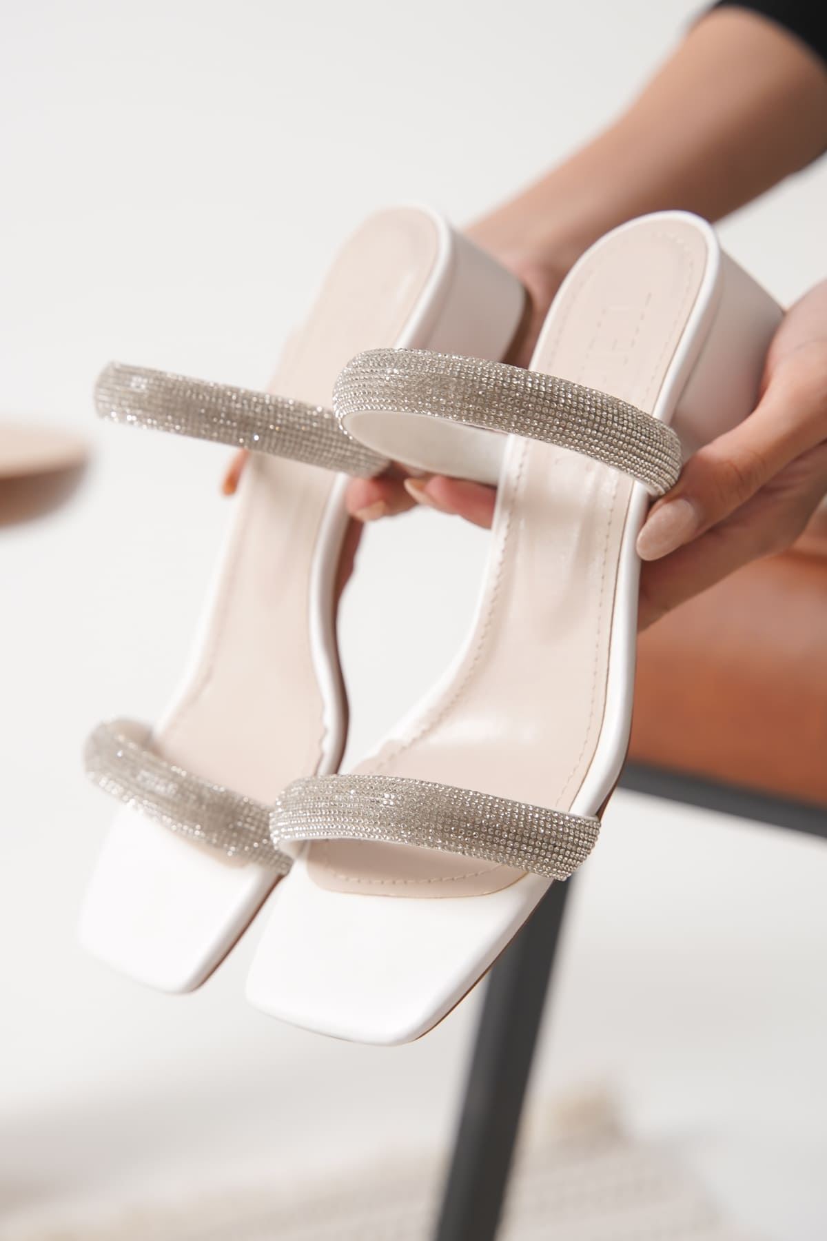 Beyaz Taşlı İnce Bantlı Kadın Topuklu Terlik TR20MY01B