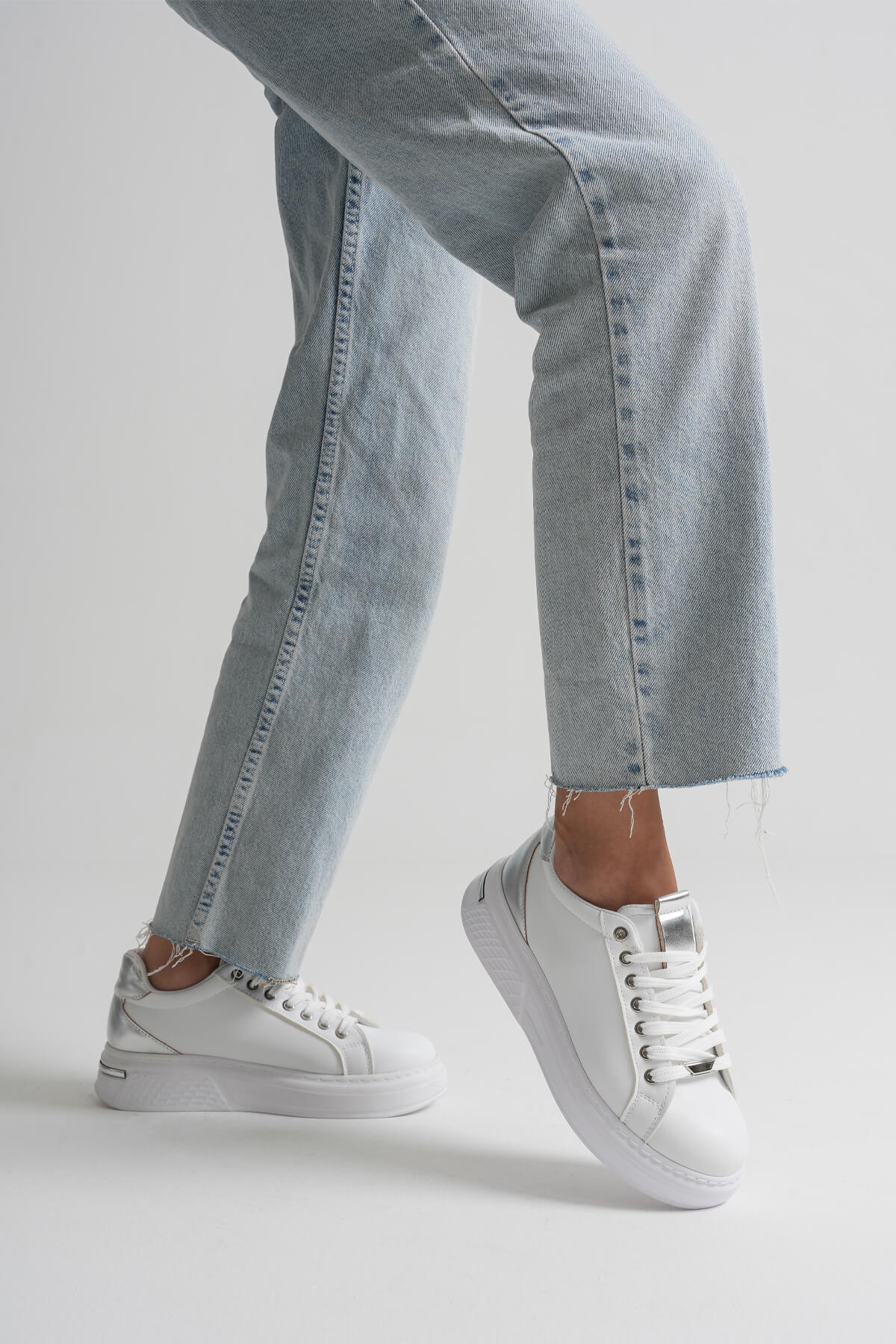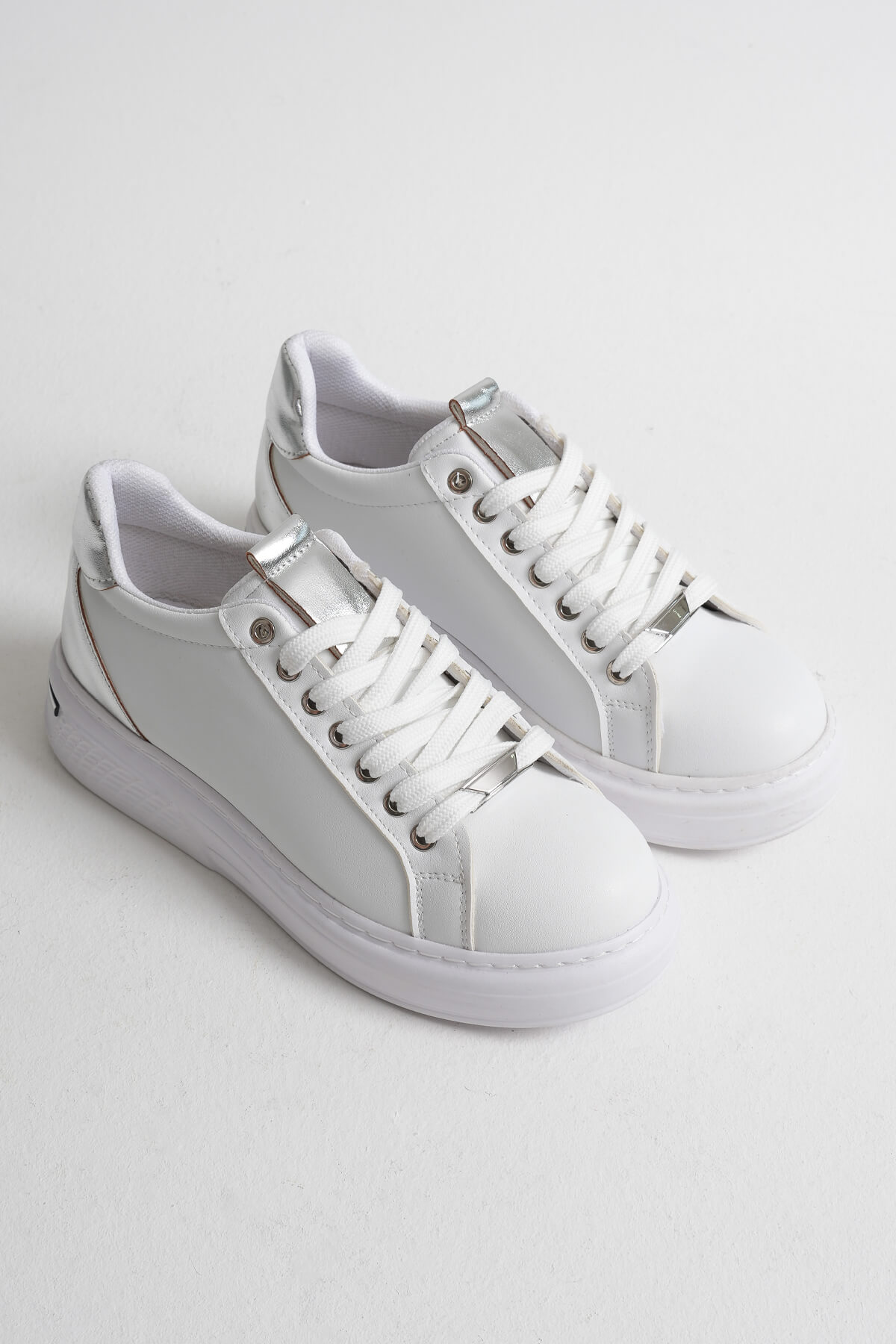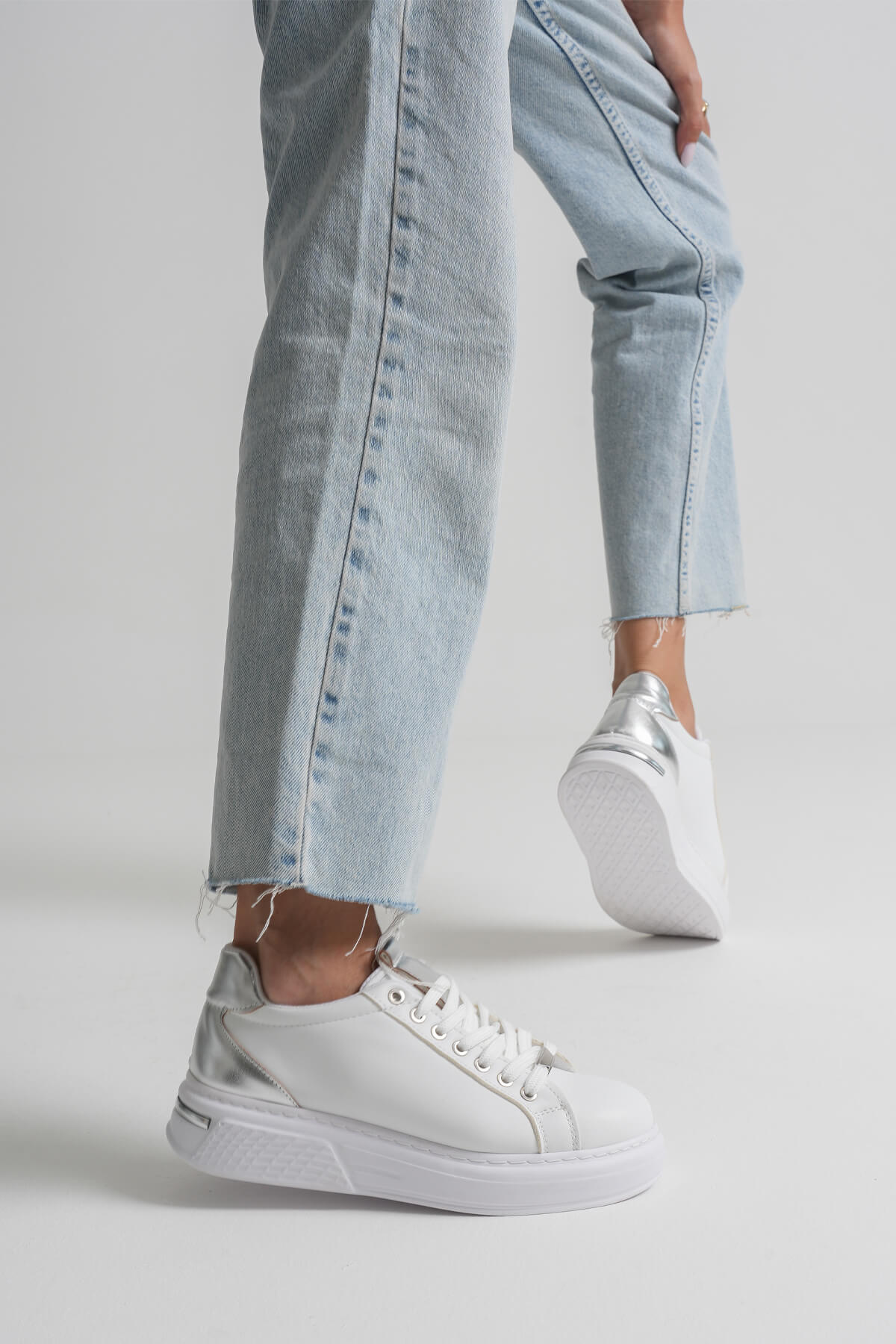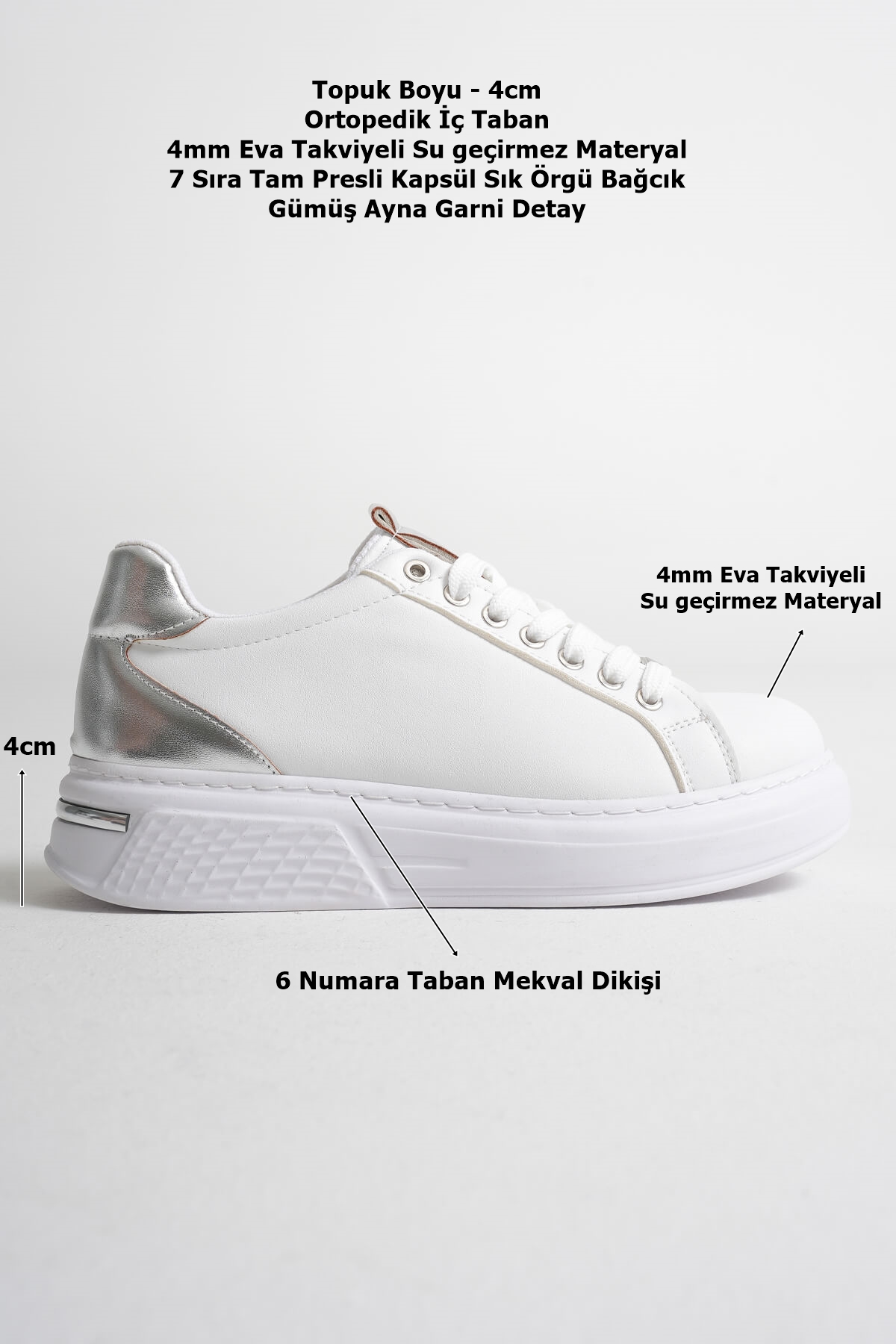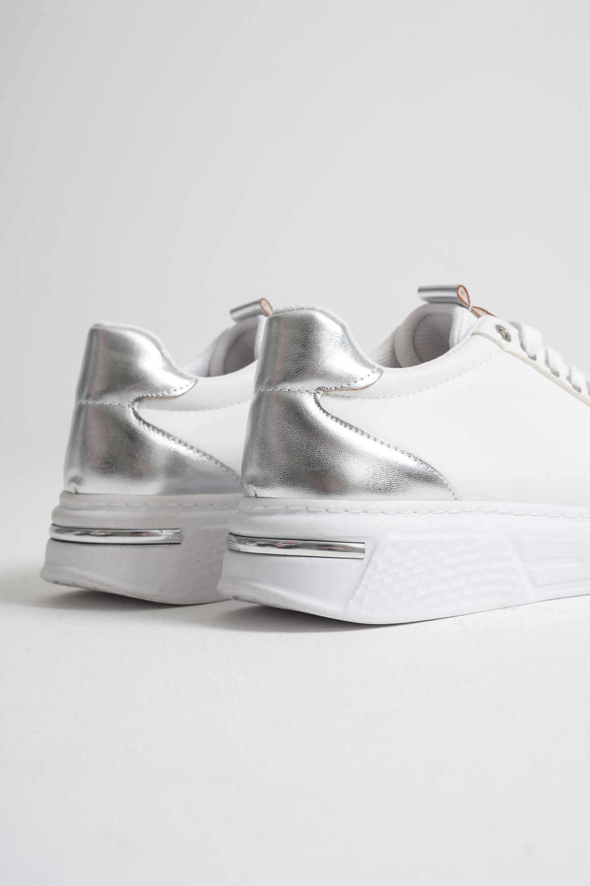 Beyazın saf ışığına, gümüş ayna garnisinin modern ışıltısını ekle. Vega; temiz, premium ve “fotoğraflarda parlayan” bir görünüm sunar. İlk bakışta minimal, yürürken iddialı: ofisten hafta sonuna, spor–şık her kombini tek dokunuşla sofistike seviyeye taşır. Ayağı nazikçe sa